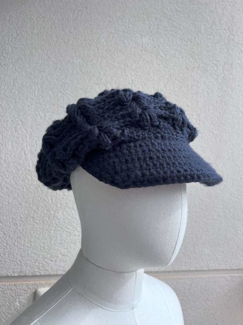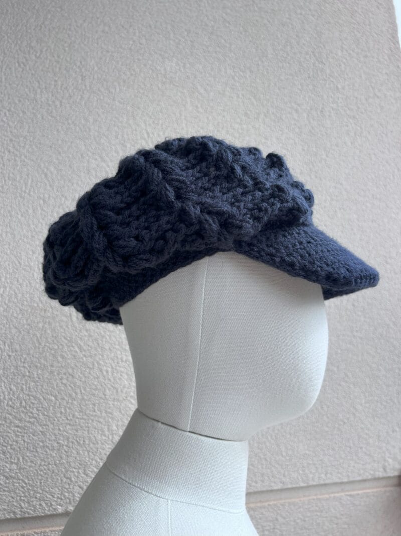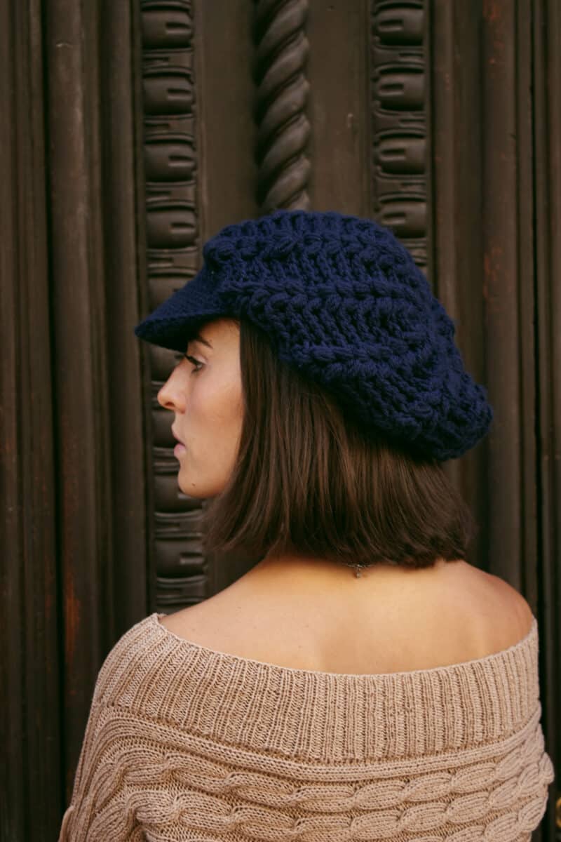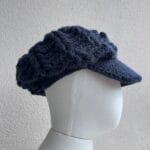 Boina de punto con visera hecha artesanalmente en España con hilo de algodón 100%, certificado OEKO-TEX Standard 100 garantiza la sostenibilidad en el proceso de producción de nuestras materias primas libres de químicos y sustancias tóxicas.