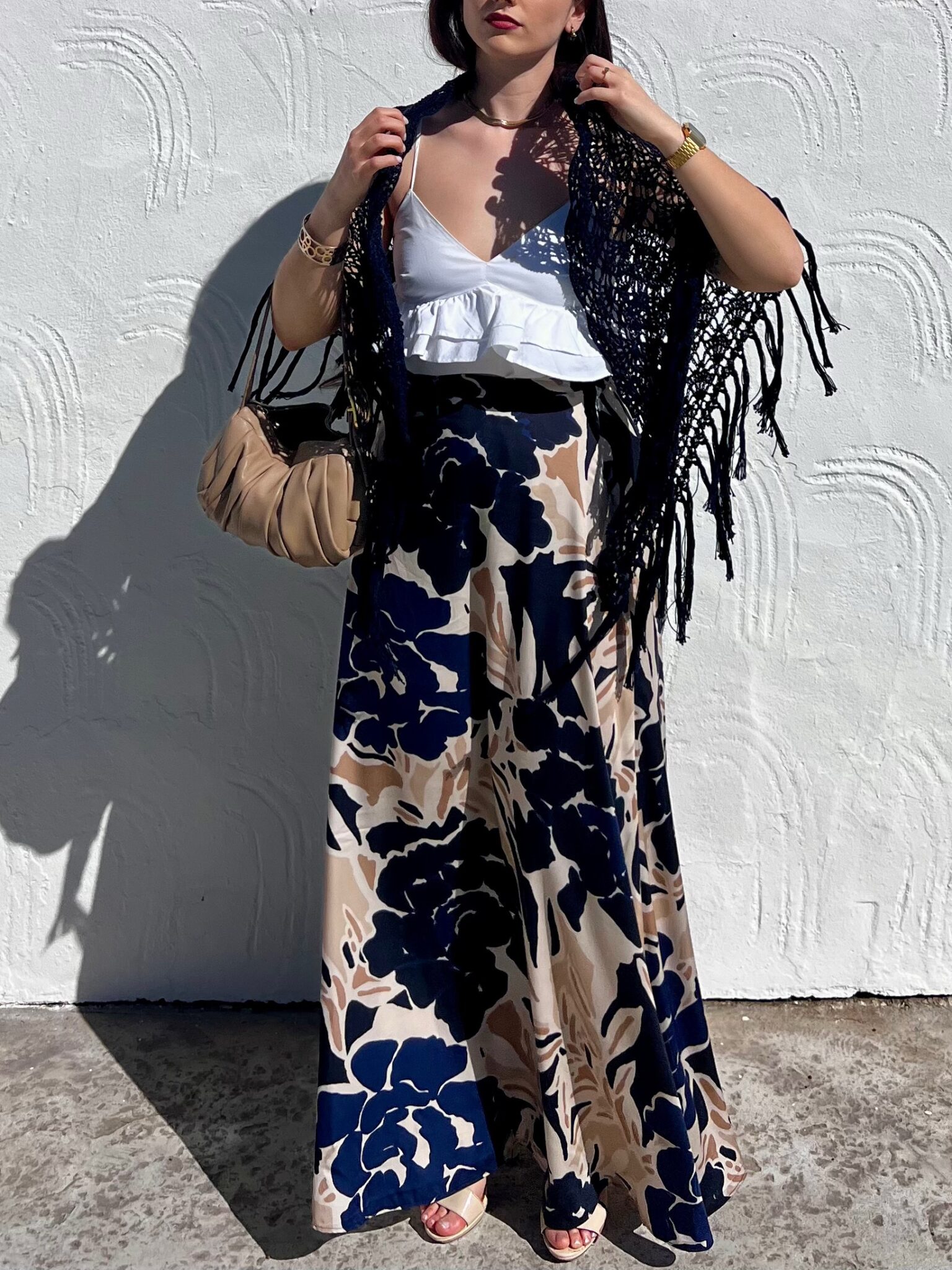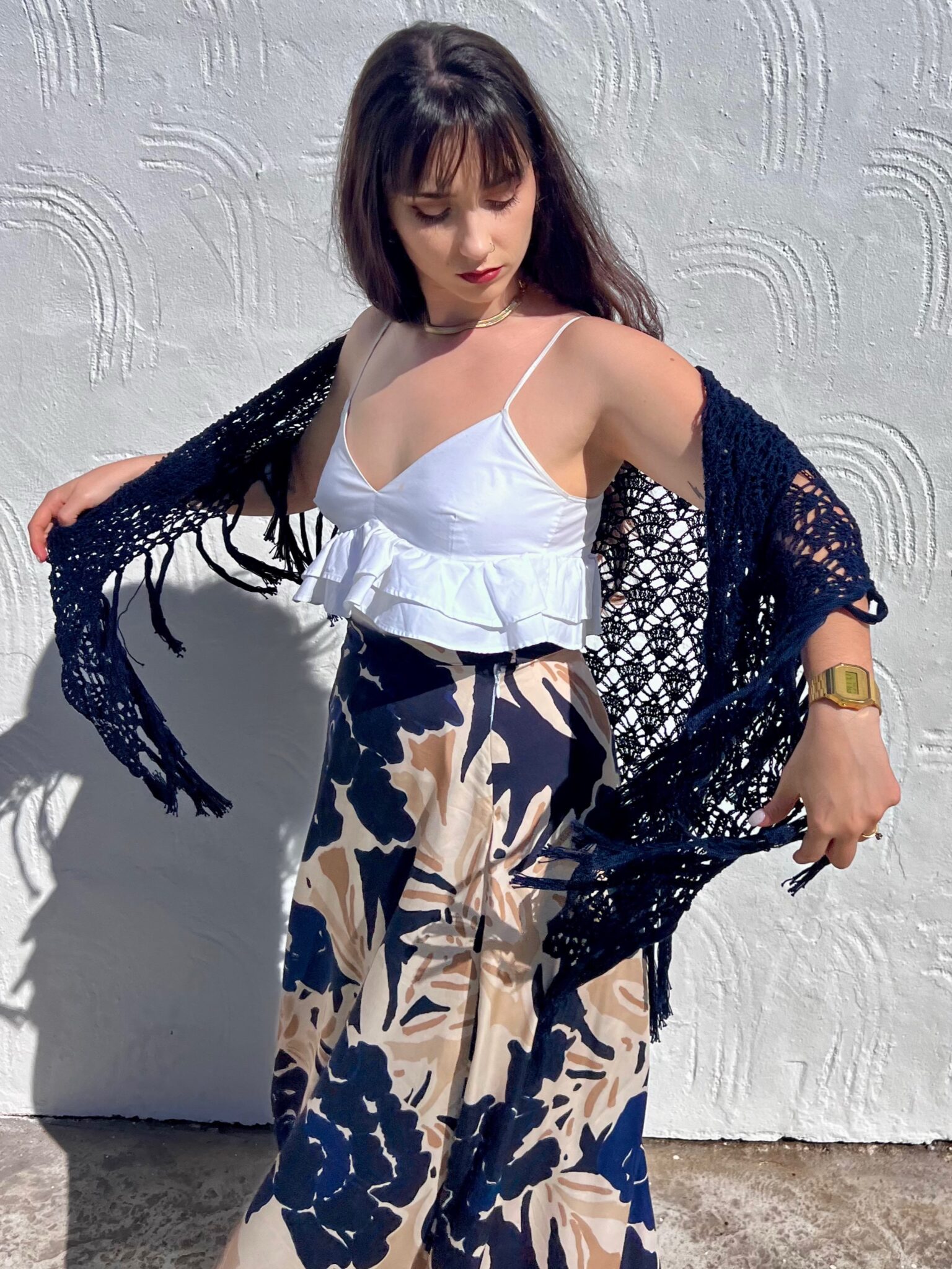 Este chal de inspiración artesanal está confeccionado en tejido fluido con un estampado botánico en tonos azul noche y crudo. Los flecos largos le aportan movimiento y estilo propio.