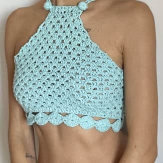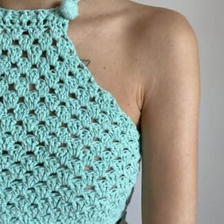 Jersey de punto con escote bardot y detalles de flecos en la mangas. Hecho completamente de forma artesanal en España con 100% algodón mercerizado de origen sostenible y libre de químicos nocivos (certificado OEKO-Tex standard 100) y nacional.