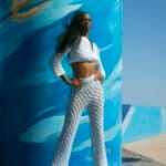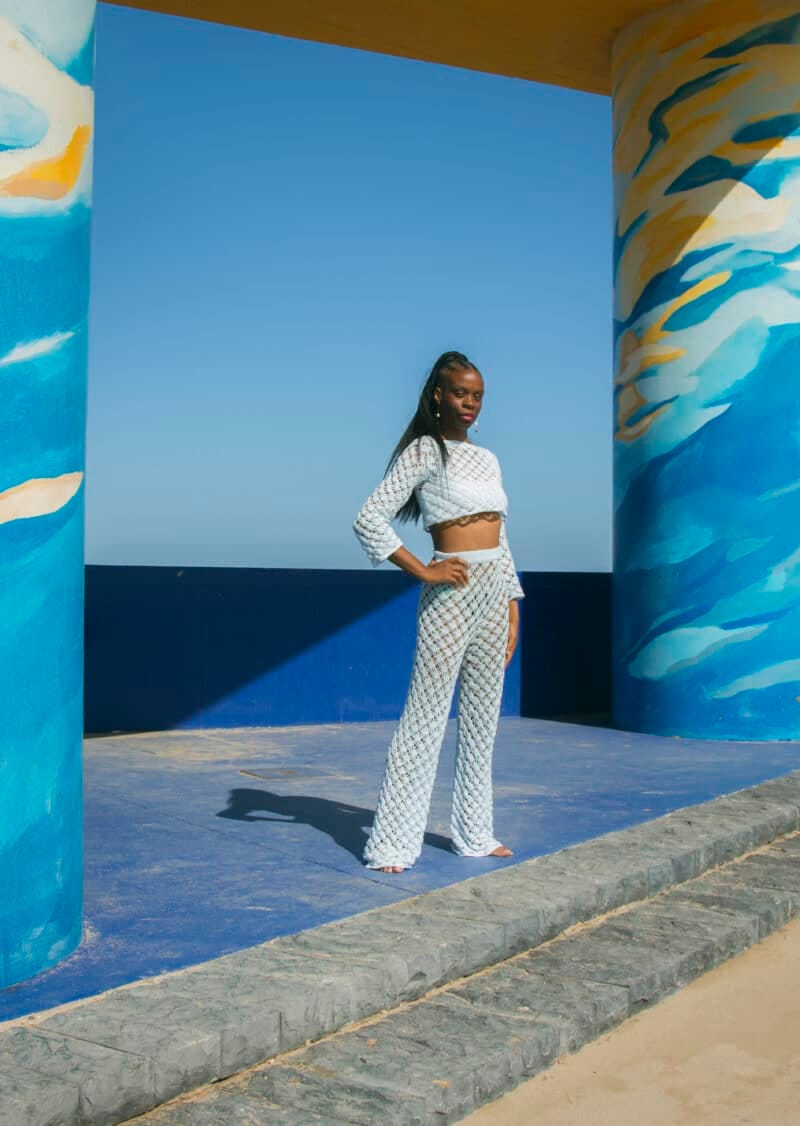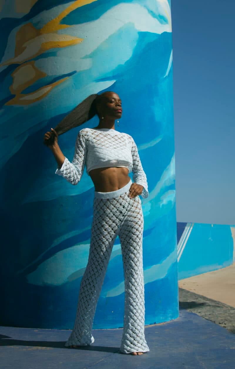 Pantalones largos hechos artesanalmente de crochet en España con algodón 100% certificado OEKO-TEX Standard 100 que garantiza la sostenibilidad de las fibras empleadas y que nuestras prendas sean libres de sustancias nocivas.