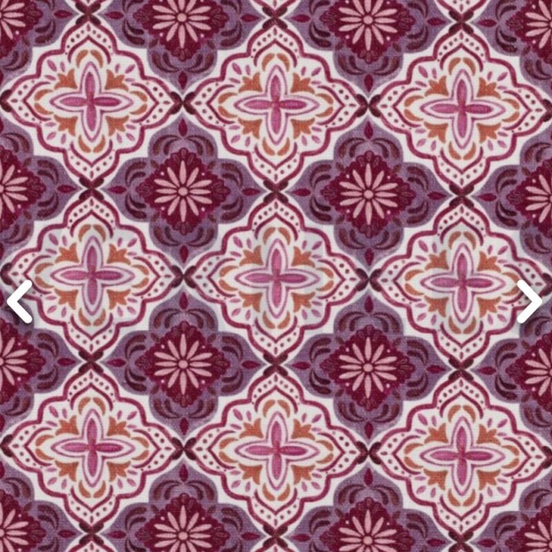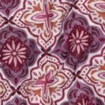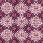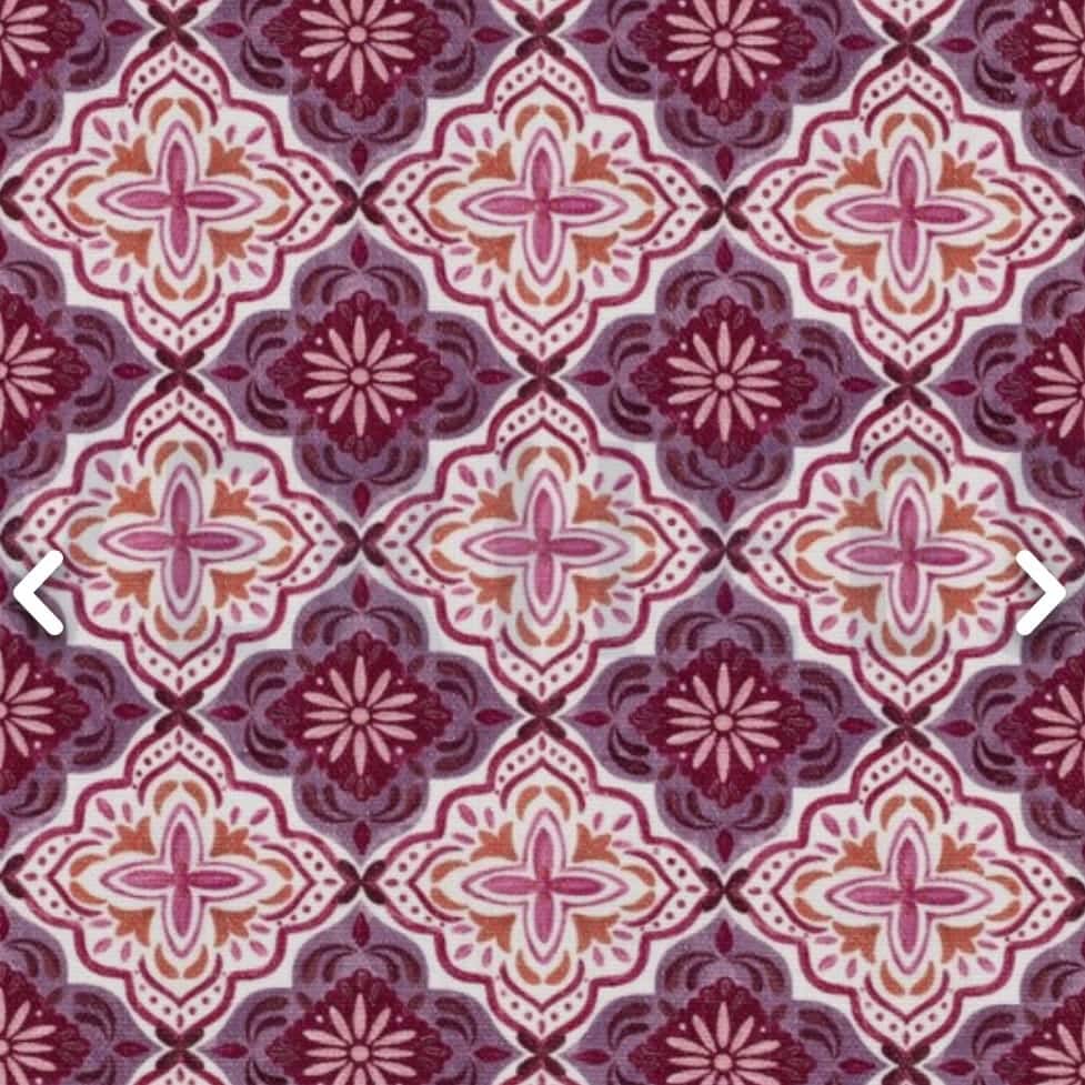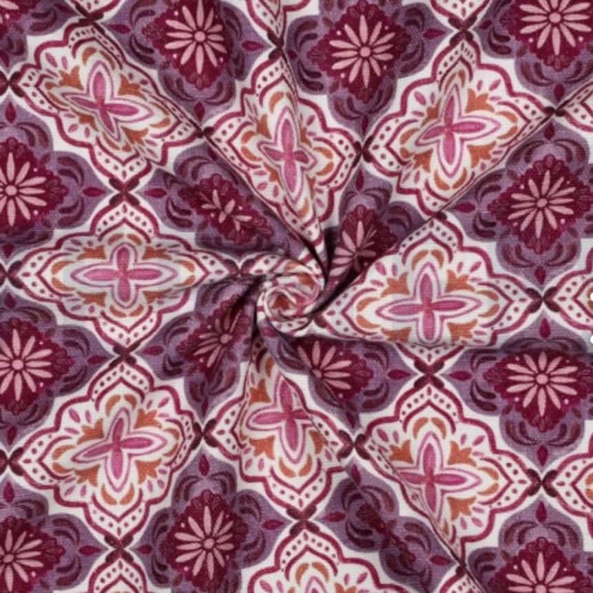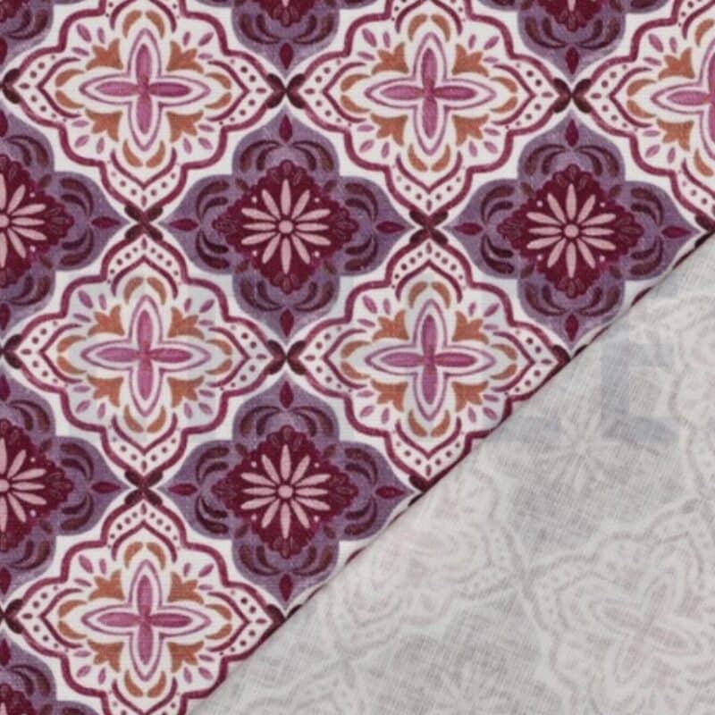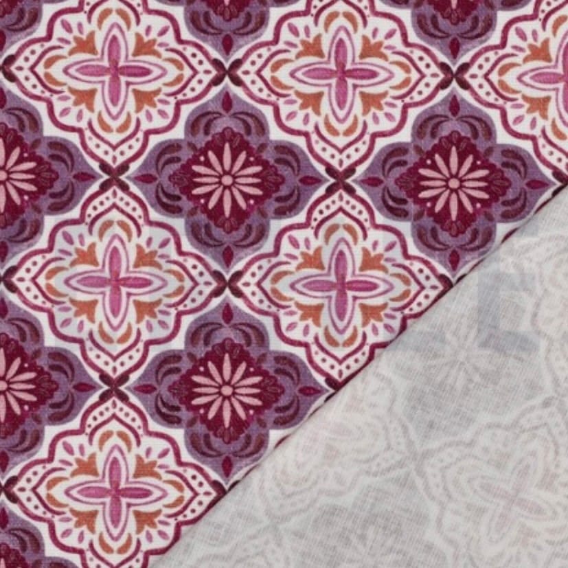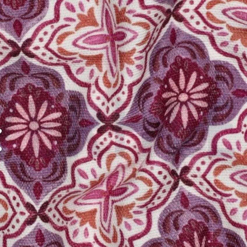 El estampado ornamental en tonos lavanda, burdeos y crudos aporta un aire decorativo y sofisticado, con inspiración clásica y carácter artesanal.