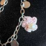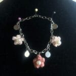 Pulsera charms de crochet hecha artesanalmente con microcrochet en España en hilo de algodón 100%, acero inoxidable hipoalergénico y perlas naturales.